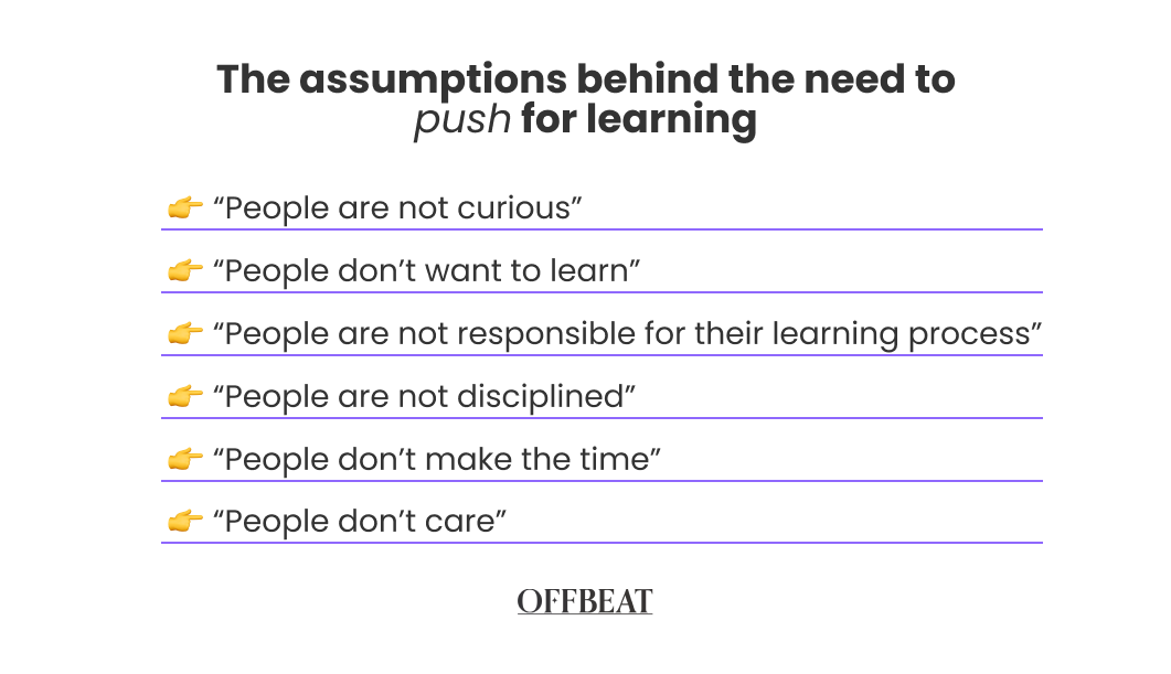 One thing we’ve carried over from the education system into the corporate world is the need to push people to learn. This mindset often rests on assumptions like: